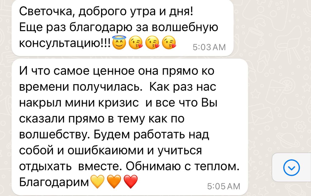 Прошла обучение в Институте психотерапии и консультирования «Гармония».